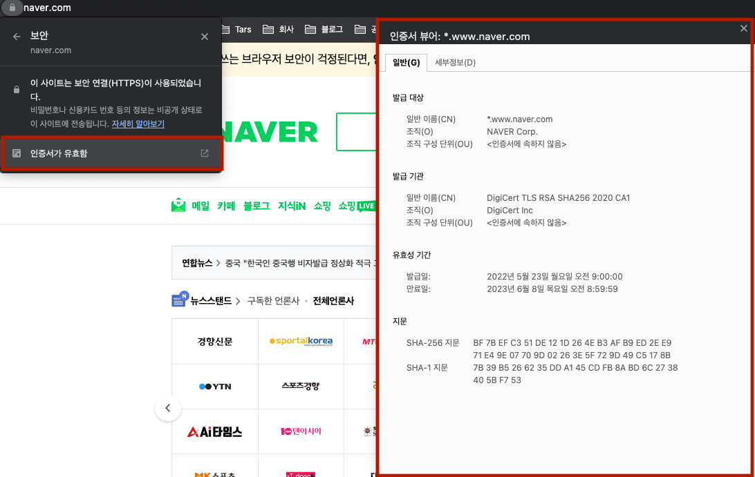 naver의 경우도 아래와 같이 url 왼쪽 자물쇠를 클릭하고 인증서에대한 정보를 얻을 수 있습니다.