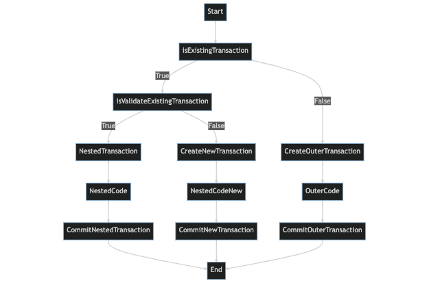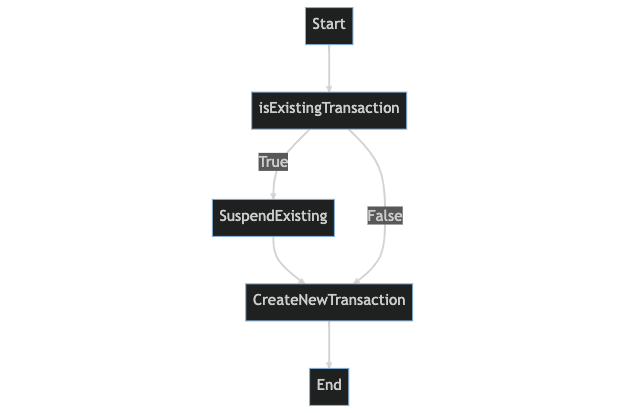 트랜잭션이 이미 존재하는 경우 새 트랜잭션이 생성되어 기존 트랜잭션 내에 중첩됨.