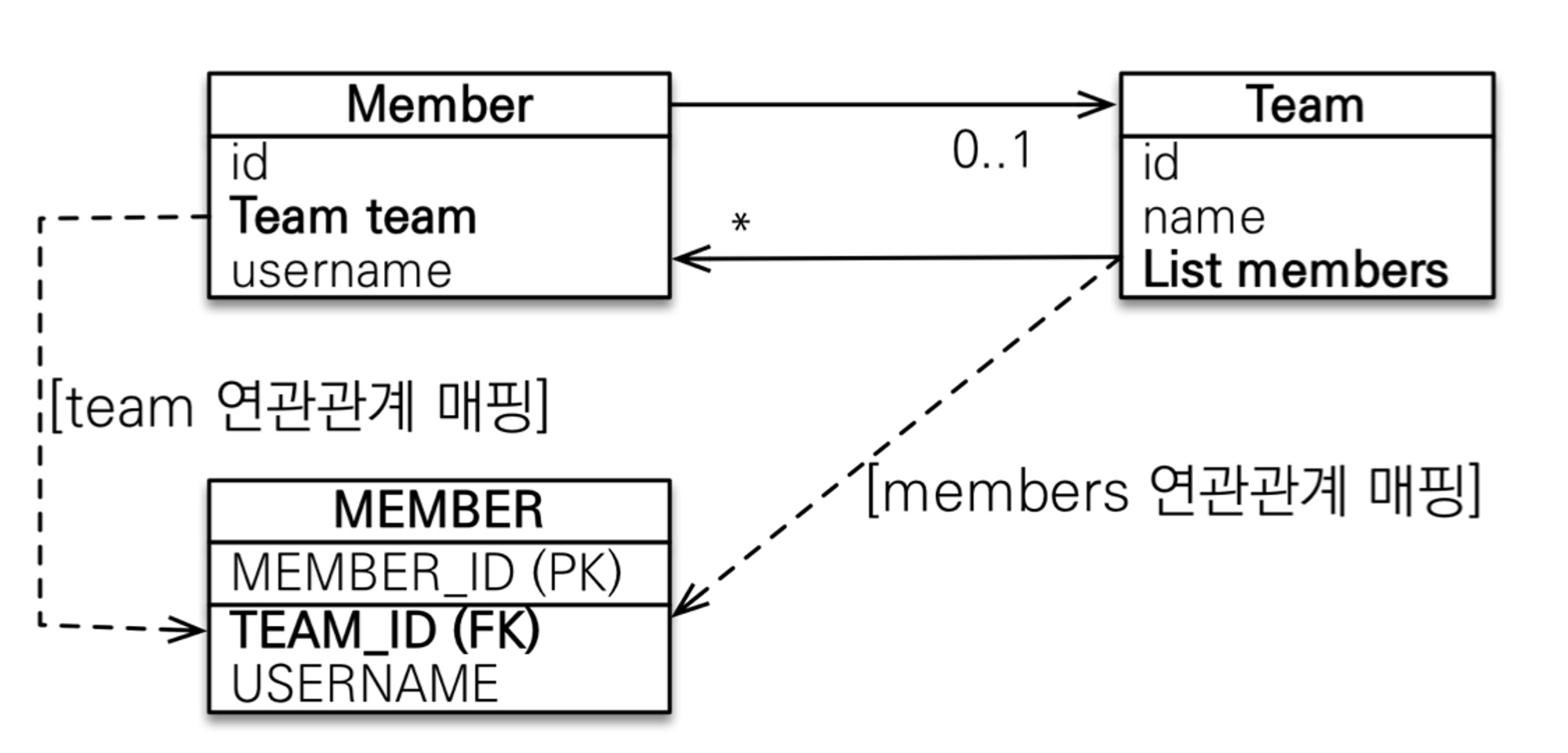 단방향 매핑을 잘하고 양방향은 필요할 때 추가해도 된다.(테이블에 영향을 주지 않음.) Team → List members 추가 한 예시