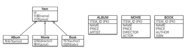 서브타입 테이블로 변환 → 구현 클래스마다 테이블 전략