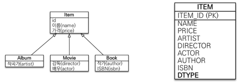 그렇다면 구분을 해야 하는데 어떻게 구분을 하는가 아이템 테이블에서 DTYPE이라는 구분을 할 수 있는 컬럼을 두어서 조인을 어떤 테이블로 할지 정해서 한다.